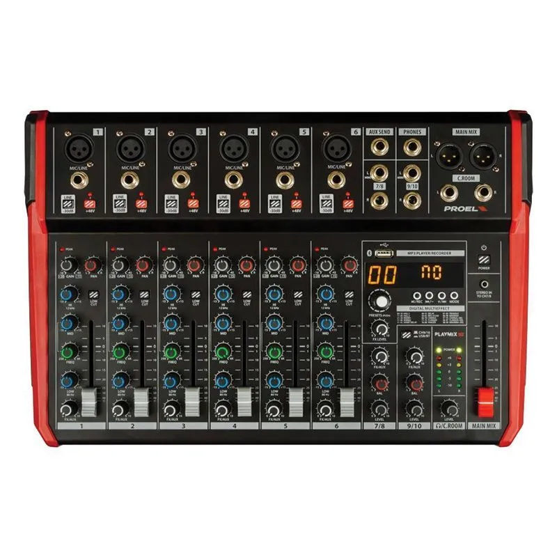 Микшеры серии PLAYMIX доступны в 3-х модификациях: 6, 8 и 10 входных каналов. Моноканалы MIC/LINE оснащены малошумящими микрофонными предусилителями с большим запасом мощности, 3-полосным эквалайзером с разверткой средних частот и HPF, а также 60-мм фейдерами управления для полного контроля над звуком. Все модели серии PLAYMIX оснащены информативным ЖК-дисплеем, высококачественным 24-битным встроенным процессором DSP со 100 студийными пресетами, стерео USB-аудиоинтерфейсом 48 кГц для записи/воспроизведения через ПК, встроенным MP3-плеером с возможностью подключения USB-накопителя, BLUETOOTH. Любой пульт Proel серии PLAYMIX станет вашим незаменимым помощником на концертах, репетиционных базах, в студии и дома.