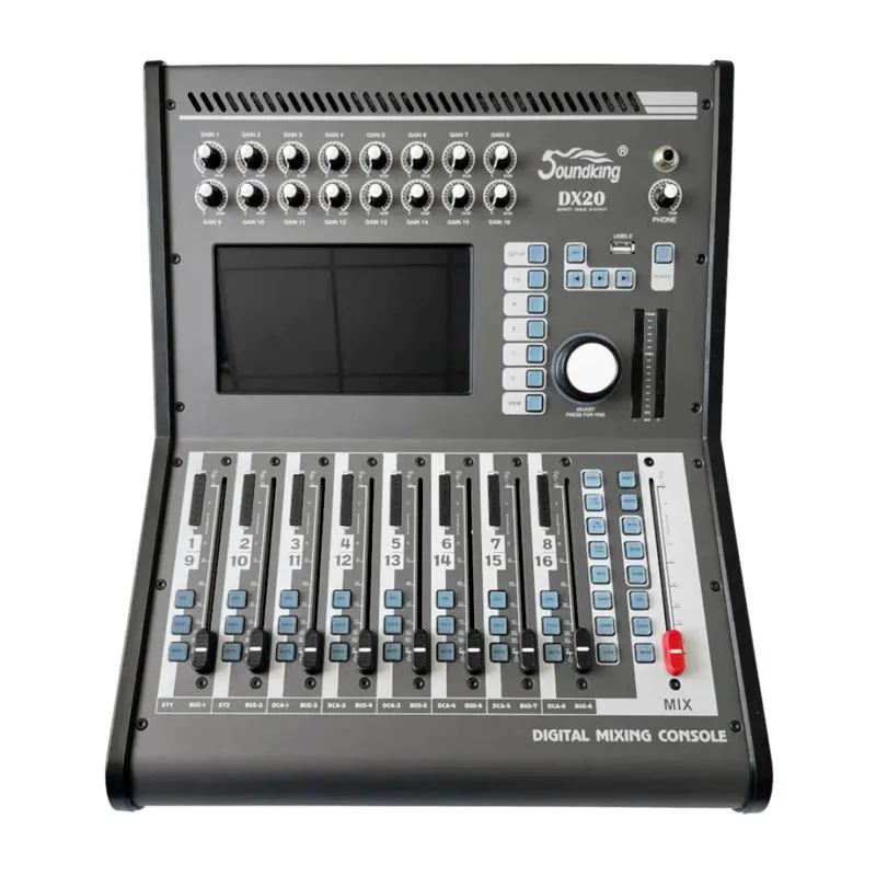 DX20 сочетает в себе преимущества высококлассного оборудования и сенсорного слайдера, использует 40-битный процессор SHARC 4-го поколения, АЦ/ЦА-преобразование 24 бит/48 кГц с 8 встроенными эффекторами: реверберация, задержка, модуляция и графический эквалайзер (20 входных каналов), 16 шин содержат 8 настраиваемых пользователем аналоговых и цифровых выходных портов.