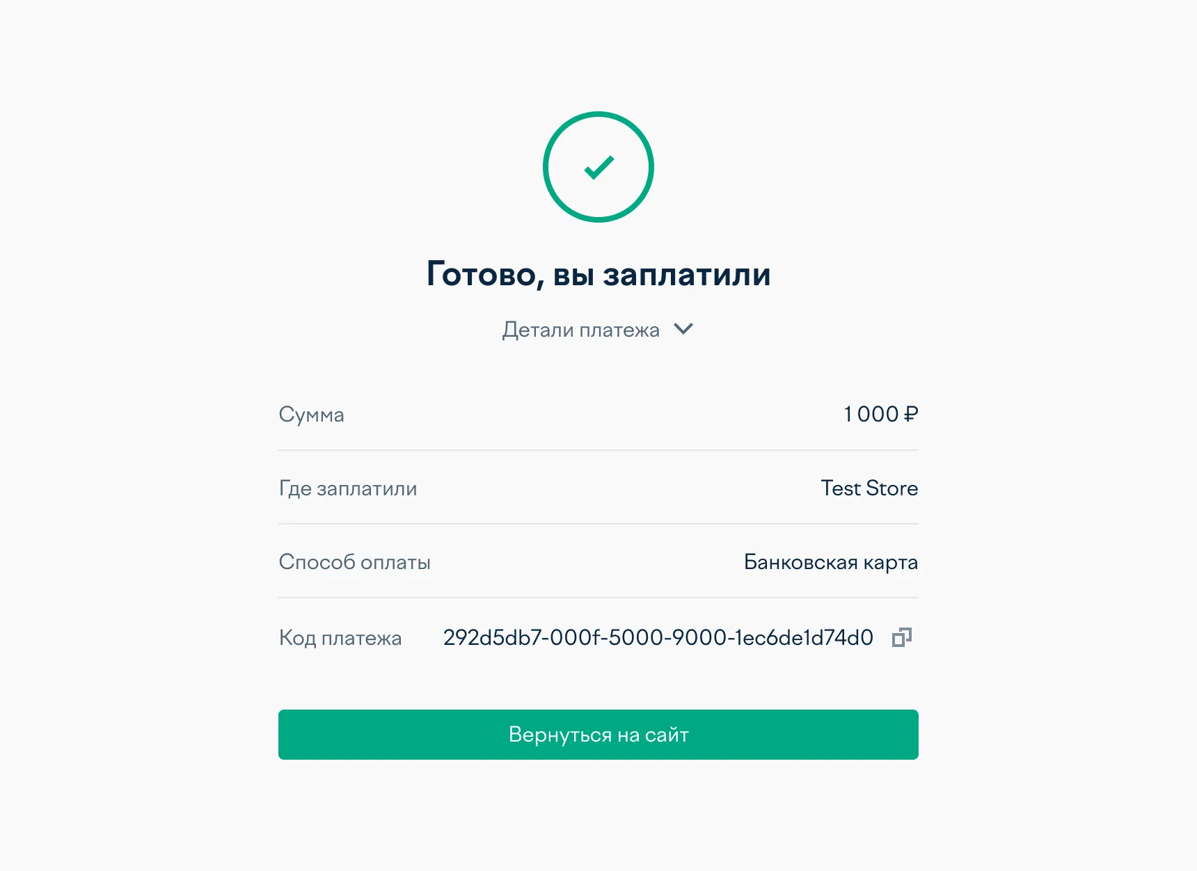 - Готово. Платёж прошёл, вы можете вернуться на сайт, где начинали платить, по кнопке Вернуться в магазин внизу страницы.